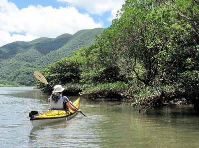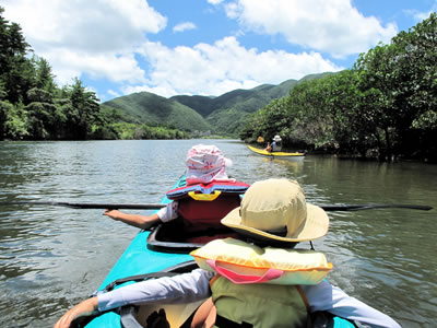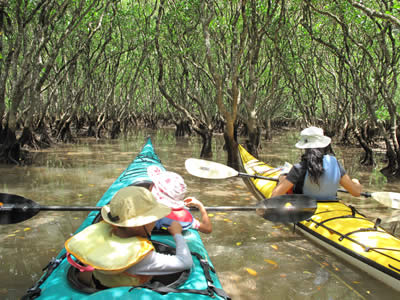 「家族のために過ごしなさい」と神様のお告げを受けたかの様に、こんなにハイシーズンの日曜日にお客さんがいないことも。それではと、シーカヤックをもって南部の住用村にあるマングローブ林へ。ここは奄美大島のマングローブカヌーツアーで有名で、一年中観光客で賑わっている。が、しかし、シーカヤックでいくシークレットコースは彼らが来ないような場所まで悠々と行けるのです。まさに貸し切り独壇場の家族でのマングローブ探検。済んだ青空にアカショウビンが羽ばたき、音もなく川を下って行くカヤックの世界を満喫。南洋クロダイの群れがカヤックが近づいても逃げもせず、マングローブの根っこには無数のかにが歩いています。根っこの形や、海から生えているマングローブの森の不思議さに、ただただびっくりする子供たち。「ぼくらは探検隊!!」なんて気分は絶好調。中州に上陸し、5歳、7歳の子供たちはそれぞれシングルカヤックに挑戦。お姉ちゃんはなかなかうまい。でも弟は見事に転覆。おおいに盛り上げてくれました。ライフジャケットで川を流れ、どん深の場所に飛び込み、子供はどこでも水遊びの王様です。こんな夏休みは、自分が子供でも最高に楽しかったでしょう、なんて感慨にふけってしまいました。