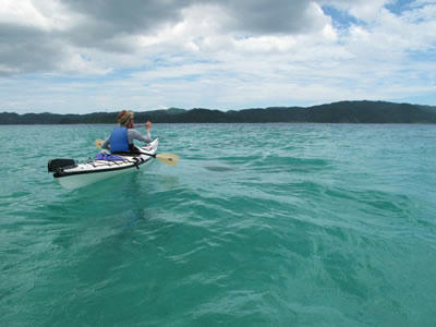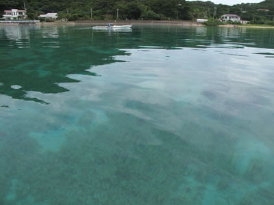 この日は前日のご夫婦の旦那さんとマンツーマン。太平洋側のサンゴをと思いましたが波が高く、北側の奄美クレーターへ。風も波も全くない水面はまるで鏡のよう。およそ10mはあろうかという海底もくっきり見えちゃう透明度。珊瑚も魚も、そして泳ぐウミガメも、まるで水族館のガラス越しにはっきり見ているかのようなカヤックからの眺め。ウミガメをみたのは初めてというお客さんも、あまりの見えっぷりに驚きの連続でした。