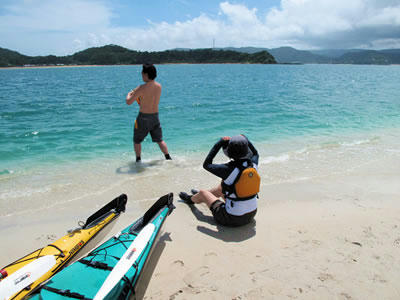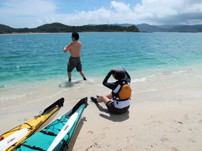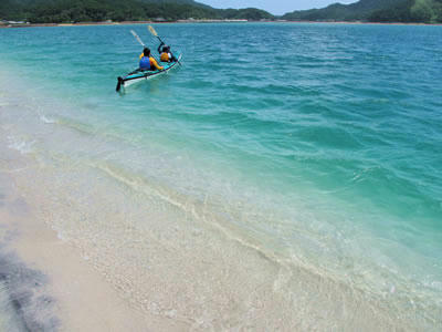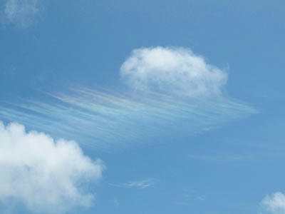 近頃は初めてガルフブルーカヤックスに来て下さる方々が増えています。みなさんネットで見つけていらっしゃるようですが、「すばらしいホームページ」とお褒めの言葉を頂きました。自分ではまだまだと思いますし、プロから見たらなんやねんこれというお粗末なホームページです。でもこんな風に思っていただける事もあるとは驚きでした。そんなお客さんのすかっと晴れたような気持ちを映してか、久しぶりに晴天の隠れ浜。それはもうブルーとホワイトの不思議なコントラストに魅せられ、ただただため息ばかりついている一同でした。そしてまたまた不思議な虹色雲。なにかよい事の前触れでしょうか。