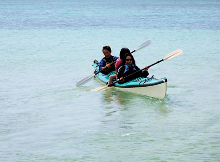足を水につけて遊ぶのも気持ちよい陽気。東京からやってきた妻の同級生家族をカヤックでご案内してきました。といっても風が強く、白いビーチの前を交代で行ったりきたり。でもそれがビギナーには無理がなくて大変楽しかった様です。とくに8才のお姉ちゃんは大はしゃぎ。うちの7才の娘とカヤックの上で立つは揺れるはであやうくひっくり返るところでした。でもビーチ前の浅い所で、なおかつ宿泊施設の真ん前でひっくりかえっても直ぐに着替えたりシャワーがあびられます。そんな気軽なカヤックも新鮮で楽しいものでした。