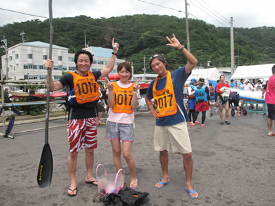 何年か前、悪天候に大潮が重なり、80艇近くが転覆して救助、もしくはリタイヤした時がありました。今年のシーカヤックマラソンはそれに匹敵するか上回るかという強風、高波の中でのスタート。いつもなら港の外で選手は並び、スタートするのですが強風と波のため、港内で待機。スタートも30分遅れるなど波乱の幕開け。そして満を持してスタートホイッスルが鳴り、揺れる海で待機していた選手が一斉に突進! バッチャン、ドッカン、バッチャン、ドッカンと激しい音をだして揺られ、ぶつかり合うカヤック同士。もみくちゃになってなかなかスタート地点から前へ出られない。そして1瞬の隙間を縫って前へ飛び出す強者の選手たち。スタートの混乱を抜けると今度は岸壁の返し波、風による激しい波がぶつかり合い、一瞬も気が抜けない。波に乗れば3つ、4つの波を一気にのっていく速さ。右、左のベテラン選手が次々に転覆していく中、必死にこらえてトップのサーフスキー集団についていく私。何度も本気で転覆しそうでしたがこらえ、どうにか駅伝トップで次の選手にバトンタッチ。そのままの勢いで女性メンバーも奮闘し、我らがアンカーはダントツでゴールイン! 昨年の2位から1位へアップ。2度目の優勝を飾りました!