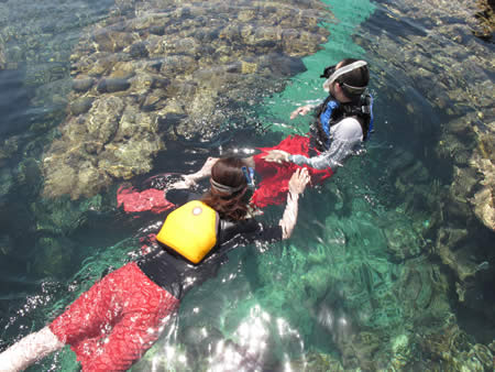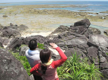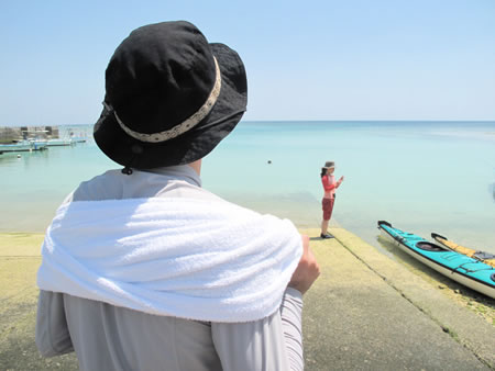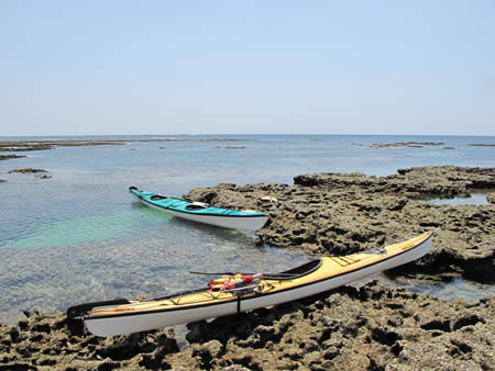 梅雨なのにこんなすばらしい晴れ間にカヤックツアーができる人もいます。まだ水は暖かくはないものの、節田海岸の珊瑚礁を堪能し、岩場からリーフを一望した半日でした。泳がなかった私ですが、リーフの上にたって海を眺めるだけで海中は丸見え。泳いでいたお二人はさぞ珊瑚礁を満喫されたことでしょう。10分くらいであがってくるかと思えば30分も泳いでいましたね。上陸後は暖かいコーヒーと島のおやつでひと休み。おまけに帰りに出くわしたウミガメのでかいこと。暑いくらいの日差しと青々と澄んだ海。たまらずぼーっとに立ち尽くすご夫婦のお二人でした。