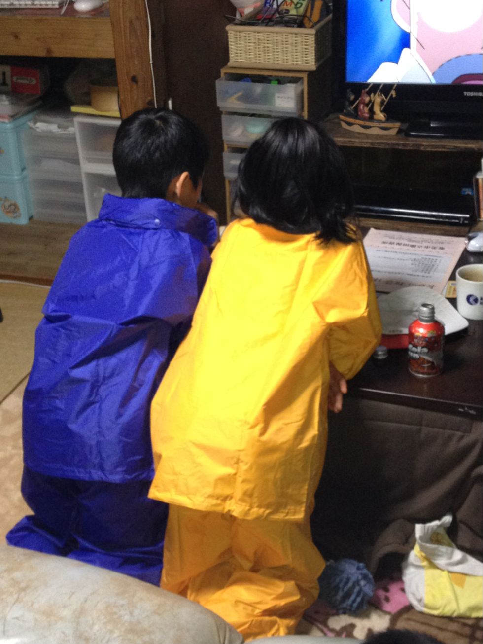 初めてレインウェアを買ってもらったこどもたち。わざわざ家のなかで着て脱ごうともしない。暑くないのか。でも小さい時自分もたいして変わらんかったな。