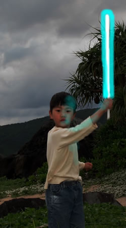 ジェダイの騎士に憧れる息子。夕方のブーケの散歩についてきて、棒をひろってすっかりライトセーバーのつもり。それをみるブーケは「はあ?」という感じ。そんなにライトセーバーがほしいならと思い、父は映像だけでもつくってあげました。