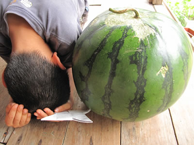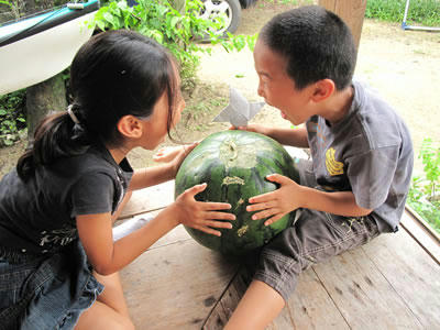 私たち家族が住んでいるのは奄美大島の笠利町は節田(せった)。そこは畜産や農家が多い集落。夕方、作業を終えて縁側で座って一息ついていたらご近所のおばあちゃんが現れた。それもドラゴンクエストのモンスター並みに突然現れた。みると手押し車に一枚の布。そして布は丸くて巨大な輪郭を描いている。おばあちゃんは「でかすぎてねえ」とさわやかな笑顔。無農薬栽培のスイカで、表面を虫が食っているから売り物にならないとのこと。そこで我が家へもってきてくれました。数日前に、やはりスイカを頂き、食べきれずに残っている。そのため、妻のフラダンス仲間に丸ごと持っていく事になりました。しかしでかい! 節田の島名農園さんは、無農薬でスイカを作っています。召し上がりたい方は、奄美大島に、こに時期の節田に遊びにきましょう。