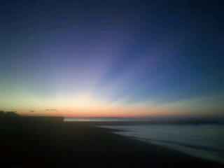 雲ひとつない早朝、七色の光が喜界島にさす。神々しい節田海外の夜明け。