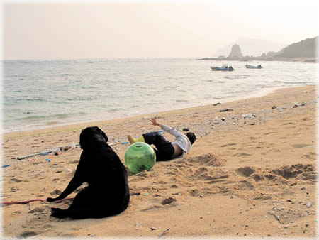 冬はどういうわけか太平洋側の奄美大島にも流れもの(ゆりむん)がやってくる。何気なく海岸を散歩しているだけで、ガラス玉が見つかったりするのだ。写真は、父がカメラを構えたら急いで立とうとした息子。