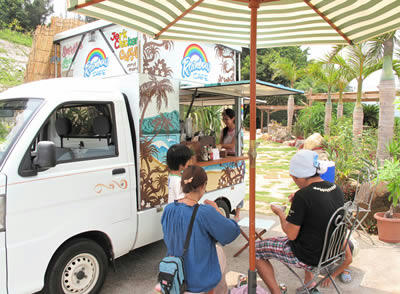 「節田がいいです」と以前からゲストにリクエストを受けていました。そしてようやく太平洋沿岸が静まり、満を持しての節田でのシーカヤック。ほんとに久しぶりです。外洋なので少し沖に行くだけで見事な海の色。ウミガメもあちこちに泳いでいます。やはりなんといっても水中の珊瑚はすばらしい。そしてアフターカヤックはみんなでランチ。7月に新しくオープンした屋台の「Rainbow cafe」へ。空港線を名瀬方面に向かい、ばしゃ山村を過ぎて約3分くらいのところ。道路左手にぽつんと小さ白い家があります。屋台はその家の前。鮮やかな奄美の海とヤシの木などが描かれた軽自動車がそれです。主力商品は店主が時間をたっぷりかけてつくるスパイス入りのレインボーカレー、600円。そのほかにタコライス 550円、ラスタ丼 500円。(メキシカンチキンののったどんぶり)などなど。さっそくカレーを頂きましたが旨いです! 今日もいこうかと思うくらいです。ぜひみなさんもご賞味下さい。