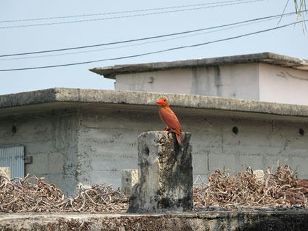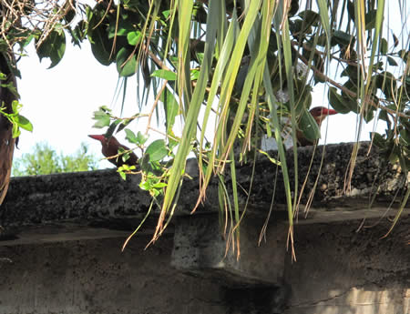 朝っぱら5時からやけに近くで「クッカルルルルル!」を連発しているアカショウビン。もしやと思って庭をのぞくと、いました。2羽が私の頭上30cmほどの屋根のすぐ上にいます。そして目前のヤシの木にジャンプしては、鋭いくちばしで穴を掘っています。その間もう1羽は小声で「クック…、クックルルル」と、何かささやくように鳴いています。「おとうさん、そうよ、その調子。ああ、そのくちばしのひと突きがすてき!」とかいってメスが励ましているんでしょうか。オス(たぶん)はそれに応えるように「どうれもういっちょいくぜい!」とばかりにダイブを繰り返します。そうです。男性に汗水流していい仕事をしてほしい女性は、とことんおだててあげる事が大切です。ほめられるとがんばっちゃうのは、人間もアカショウビンもきっと同じですね。