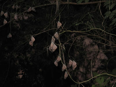 子どもが入っている手熟師会。12日の早朝からアサギマダラという蝶の観察会があり、行ってきました宇宿漁港(空港のそば)。この蝶は越冬のため、群れになって枝やつるにぶら下がっているのです。先生に連れられ、薄暗い森に入る10世帯くらいの親子。すると、あっというまに見つかりました。樹の枝にとまっています。先生がいて教えてくれないと、暗いうちは木の葉っぱと変わらず、見過ごしてしまいます。いましたいました。群れになっていたり、バラバラになっていたり。こんな家の近くの森にいたんですね。やがて夜が明けてあたりが明るくなるとアサギマダラも飛んだり動いたりします。見渡すとパパイヤもあり、生き生きとした新芽が生えていました。