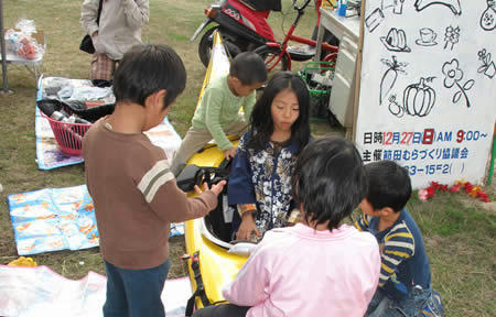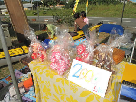 12月27日、日曜日。心配された天気も晴れとなり、心地よい日差しの中で恒例のアマンデー市が催されました。アマンデー市とは、この節田村づくり活動の一つで、地場産品や地場産業を盛り上げようという試みです。農家のとれたて野菜、各種フリーマーケット、ミニステージでの島唄、餅つきやゲームなどで盛り上がります。ときおり中古バイクのような意外な物が出店され、意外にもが売れてしまったりもします。私はシーカヤックを展示し、ツアーの写真の閲覧、無料カタログの配布などで立ち寄られる方達とコミュニケーションを計りました。年々ガルフブルーカヤックスのブースに立ち寄って下さる方が増えてきました。さらに今年からは妻がやる気をだし、ハワイ柄の生地でつくったくまの人形「アロハベア」や、子供の小さくなった服を出品しました。初めてにしてはまずまずの成果だったでしょう。そして今日はどしゃ降りの雨。本当にお天気に恵まれました。