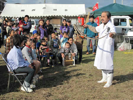 忙しくってすっかり過去の出来事になってしまいましたが、節田集落では23日に恒例の種おろしが行われました。なにそれっていう方々に説明いたします。10月の終わりごろ、集落の各家庭を組ごとに踊りまわるのです。例えば新婚さんの家とか、新築した家とか、赤ちゃんが生まれた家とか、おめでたいところを回って行くのです。そして昼から飲みまくり、食いまくり、それはそれは盛り上がるお祭りなのです。