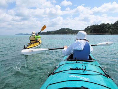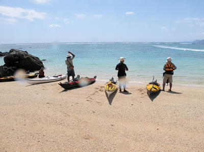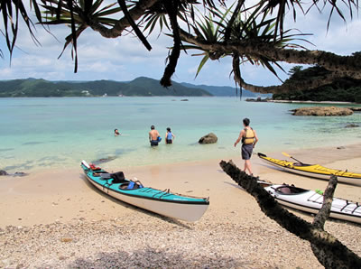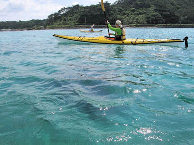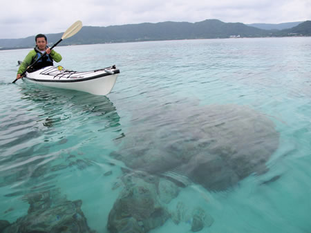 梅雨なのにこんなすばらしい晴れ間にカヤックツアーができる人もいます。まだ水は暖かくはないものの、節田海岸の珊瑚礁を堪能し、岩場からリーフを一望した半日でした。泳がなかった私ですが、リーフの上にたって海を眺めるだけで海中は丸見え。泳いでいたお二人はさぞ珊瑚礁を満喫されたことでしょう。10分くらいであがってくるかと思えば30分も泳いでいましたね。上陸後は暖かいコーヒーと島のおやつでひと休み。おまけに帰りに出くわしたウミガメのでかいこと。暑いくらいの日差しと青々と澄んだ海。たまらずぼーっとに立ち尽くすご夫婦のお二人でした。