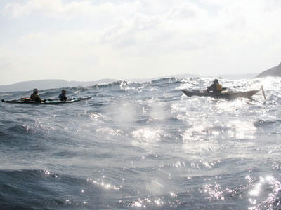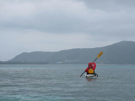 「雨なんて関係ない! 風だって少々へっちゃらだ!」と叫ばんばかりの気合いを入れ、風雨の中でカヤックマラソントレーニング。思えば自分が初めて奄美に来たのは、14年ほど前の奄美シーカヤックマラソン加計呂麻大会。あの日、あの時の会場の熱気、青空、そして青い海を、いまでも目を閉じれば思い出します。こんなに美しい海がこの世にあるのかと感動し、いつも、何度でもここに身を置きたいと夢を描いたものでした。あれから14年。いま、目を閉じて浮かぶのは、青い海ではなく、怒る妻の赤い顔だけです、なんてキミマロさんみたいな回想をしてしまいました。さて、冗談はこのくらいにして話を戻します。シーカヤックマラソンにでるからといってやってくる人たちには、ちょっと私も厳しくなります。ツアーではあまり細かいことはいわないですが、レッスンとなると別。もちろん一回は必ず転覆してもらいます。少々風に吹かれて苦しんでいても助けなかったり、あえて怖い横波を受けるコースを通ったり。ラストは思いっきりダッシュでこいでもらったり。でもこれが大事。シーカヤックマラソンは確かに安全対策がされ、そこで遭難とか、大事故にはなりにくいです。が、風はふくし、波は立つし、そんなのは自分でクリアーしていって完走しなくちゃなりません。だから多少厳しい状況も漕ぐことで、体を慣らしていくのです。もっとも、大島海峡内で吹く風、立つ波なんて風や波のうちに入らない、とベテランはいうでしょう。しかし、今年初めて出るとか、カヤックを2〜3回漕いだことがあるだけという人には、容赦なく感じられることもあるのです。さあ、どんと漕いでおきたい方、雨でも風でも海で遊びたい方、待ってますよ!