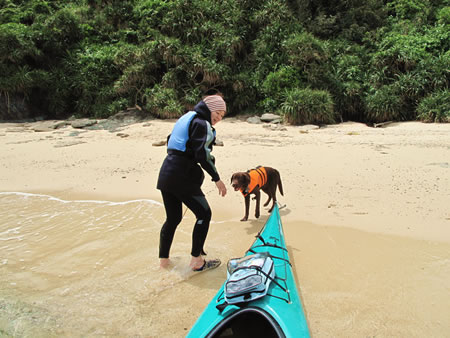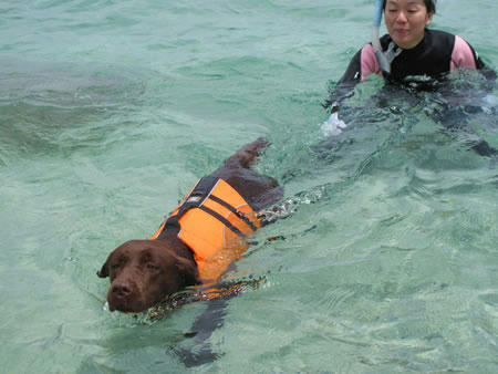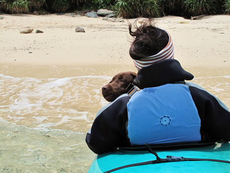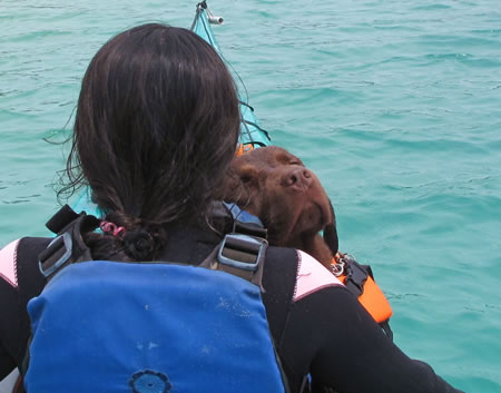 1歳のチョコラブをつれての1dayシーカヤック。旅行も、海も、ましてカヤックも初めての体験だそうです。おっかなびっくり飼い主さんとカヤックに乗り込み、慌てるかと思いきや意外とおとなしく乗ってくれました。そして誰もいない海岸に上陸するや、大はしゃぎ。水辺には最初はおそるおそる近づくのですが、僕が木の棒を海へ投げるといきなりダイブ!! さすがラブラドール。でもその後はおっかなびっくりしてなかなか入りません。シュノーケルでリードする飼い主さん。ついていきたいんだけど怖いのでわんわん鳴きます。とうとういられなくなるとたまらずダイブ。そして飼い主さんのところへ必死についていきます。気がつけばどんどん泳げるようになりました。とにかく体力を使い果たすほど泳いだようで、帰り道のカヤックの上ではいびきをたててグッスリ眠ってしまいました。全力で遊んでぐっすり眠る。幸せですね。これに懲りずにお水大好きになっていってほしいです。また一緒にあそぼうね。それまで僕を覚えていてくれるかな?