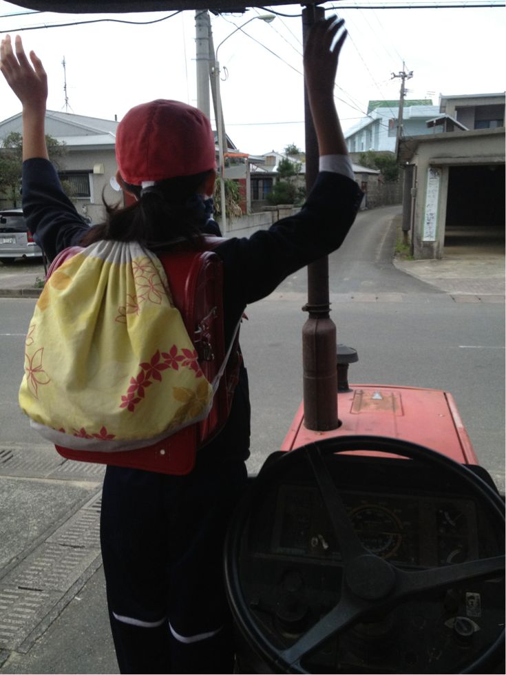 トラクターにのせろとせがむ娘。タンタンタンと校門まで。おおらかな島です。都会でやったらPTA会議で非難間違いなしだね。