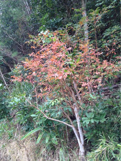 広葉樹がない奄美の山は、いわゆる内地の紅葉というものはないのです。が、そんな山に赤い彩りが。それはうるしの仲間、ハゼという木。だめなひとは下を通るだけでかぶれるとか。この実は和ロウソクの原料になるって、しってましたか?