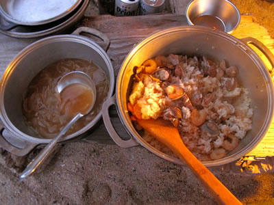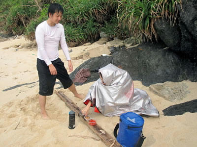 天気予報は雨でしたが、どうにか時々降る小雨程度でもちました。晴れ間もでて嬉しい限り。そんな中シュノーケルをして冷えた女性は、緊急用の保温ブランケットにくるまって暖まりました。その姿、どうみてもどこかの宇宙人のお姫様か、雪山で救助された人。銀のローブからにょきっと手をだしておやつを取る姿はなんともかわいらしく、おもしろおかしく楽しませてくれました。