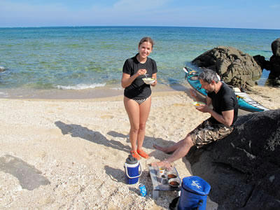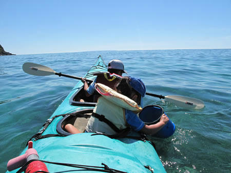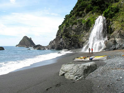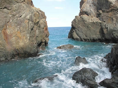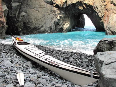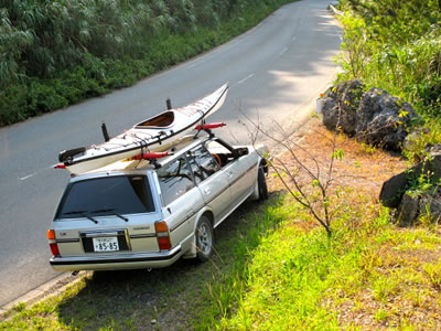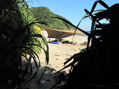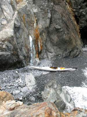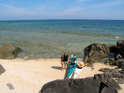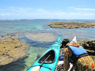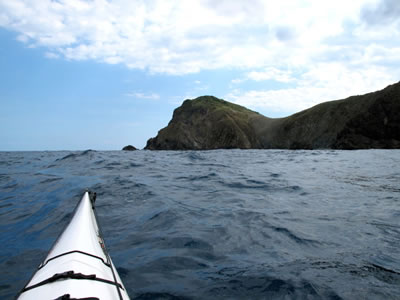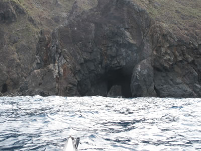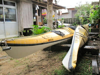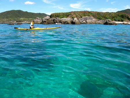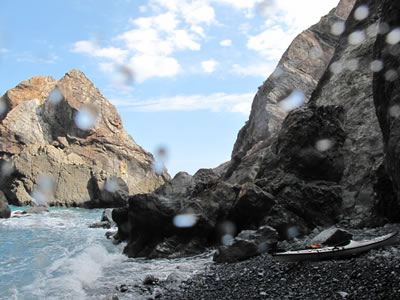 懲りない男一号が、再び洞窟探検へ向かいました。台風の影響がまだ少々残っています。カヤックの先を波が洗っていきます。飛沫が目にしょっぱい。でも以前よりは静か。今日こそ洞窟内部へ上陸か。見えてきた入り口。波はこの前よりちいさいものの、カヤックには充分でかいです。おっかなびっくり侵入。入りました、ついに。世界初(たぶん)、奄美大島市崎の青い洞窟に、手こぎ船で入りました。ですがめちゃくちゃ轟音をあげ、波がごろた石の浜に打ち付けています。おれは無事に上がれるか、どうか、上がりました!でもカヤック横倒しになり、波にもまれてびしょ濡れです。あわててサンダルも脱げます。(けっこう興奮しちゃいました。)