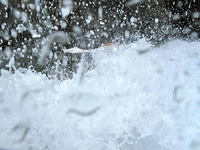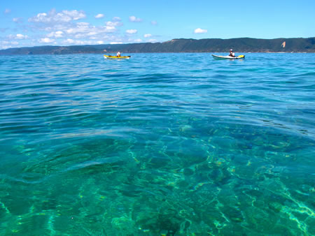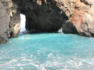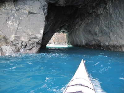 ふうっと一息ついて周りを見直すと、そこはそびえたつ岸壁に囲まれた場所。一見濁っているような水は、実は幻想的なクリアーブルー。その不思議な透明感はまさに光の芸術。自由に泳ぎ回る小魚の群れは、水色のゼリーの中に閉じ込められた泡のようでした。ホールの中はカヤックが激しく上下に揺さぶられる荒波。ゆっくり撮影もままなりません。様々な角度からの反射で、不思議と水の底からライトアップされているようなあの青さ。現実に目の当たりにした人にしかわからない素晴らしさです。