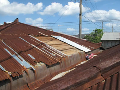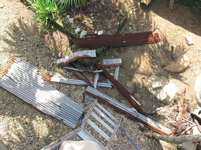 そして雨もやみ、少し晴れた21日。屋根をみたら案の定。ぶっとんでました。もうこんな日は大工です。